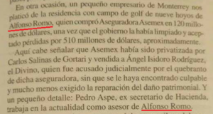 Pues es que en el libro mencionado anteriormente, que se titula “FOBAPROA: Expediente Abierto”, se menciona, que Alfonso Romo adquirió la Aseguradora Asemex por un costo de 120 millones de dólares, un precio que no llegaba ni a la tercera parte del costo que debería ser.