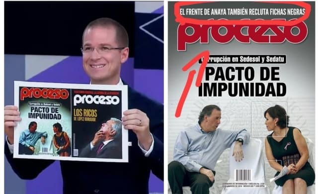 Pero esto no pasó desapercibido por Ricardo Anaya, el cual inmediatamente buscó entre sus materiales de apoyo, un argumento para contestarle al Tabasqueño, mostrando el también una cartulina en la que venían 2 portadas de la misma revista “PROCESO”, en la que los títulos decían: