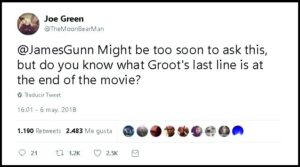 “Podría ser demasiado pronto para preguntar esto, pero ¿Sabe cuál fue la última línea que dijo Groot al final de la película?