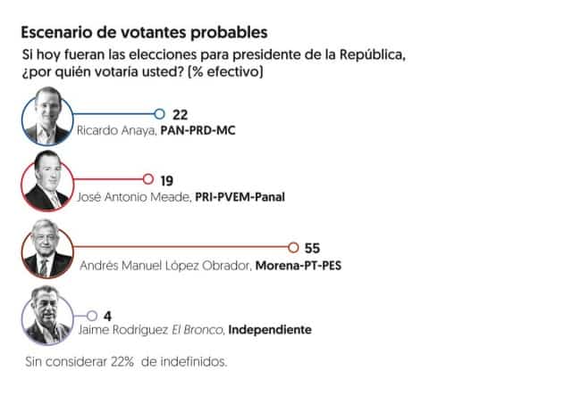 Se puede ver claramente cómo se posiciona al candidato de “Juntos Haremos Historia” al frente de los demás candidatos con un aplastante 53% de preferencia, perfilándose como el posible ganador en la elección de este domingo, así como también dejando en segundo lugar a Ricardo Anaya, en tercero a José Antonio Meade y en ultimo a “El Bronco” con un 7% de preferencia.