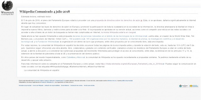 Fuente: Tomado de (https://es.wikipedia.org/wiki/Wikipedia:Comunicado_4_julio_2018)